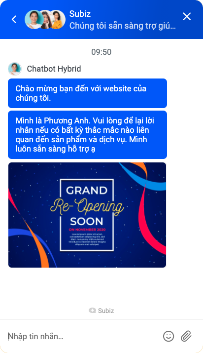 Bot sẽ tự động chào khách truy cập và giúp bạn hỏi một thông tin bất kỳ và phân phối hội thoại đến đúng tư vấn viên phụ trách.