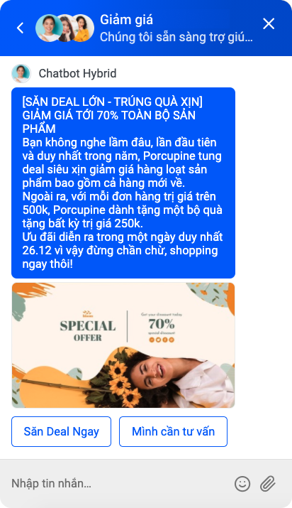 Bot sẽ thay bạn đưa ra những ưu đãi đến toàn bộ khách hàng cũng như trả lời các thông tin liên quan.