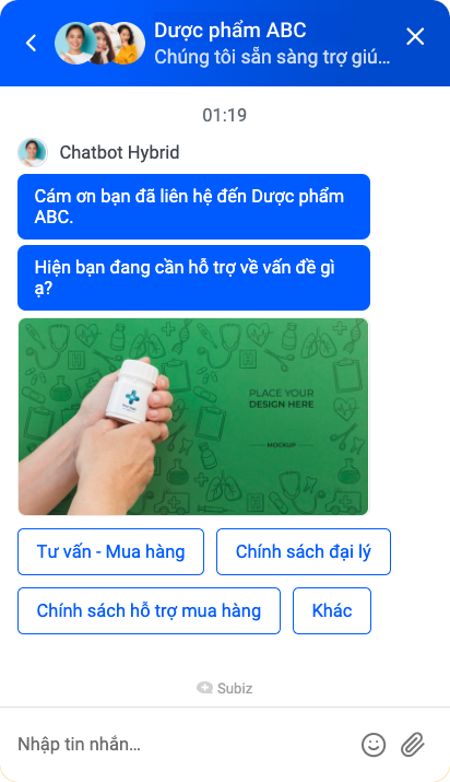 Kịch bản Bot giúp khách hàng của bạn tìm hiểu thêm về sản phẩm, chính sách đại lý, mua hàng và dịch vụ mà bạn đang cung cấp.