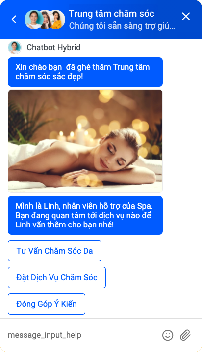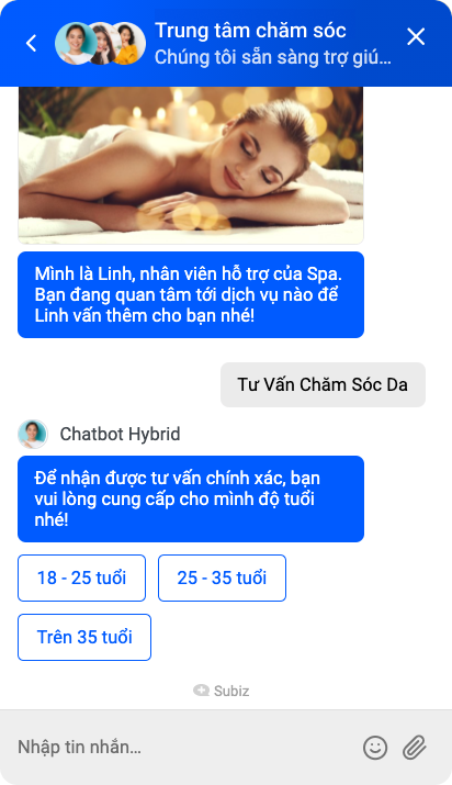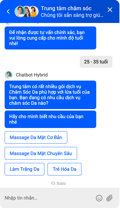 Bot sẽ tìm hiểu các thông tin cơ bản như độ tuổi, dịch vụ mà khách hàng quan tâm để từ đó chia sẻ các thông tin hữu ích hoặc hỗ trợ khách hàng đặt lịch hẹn trực tuyến.