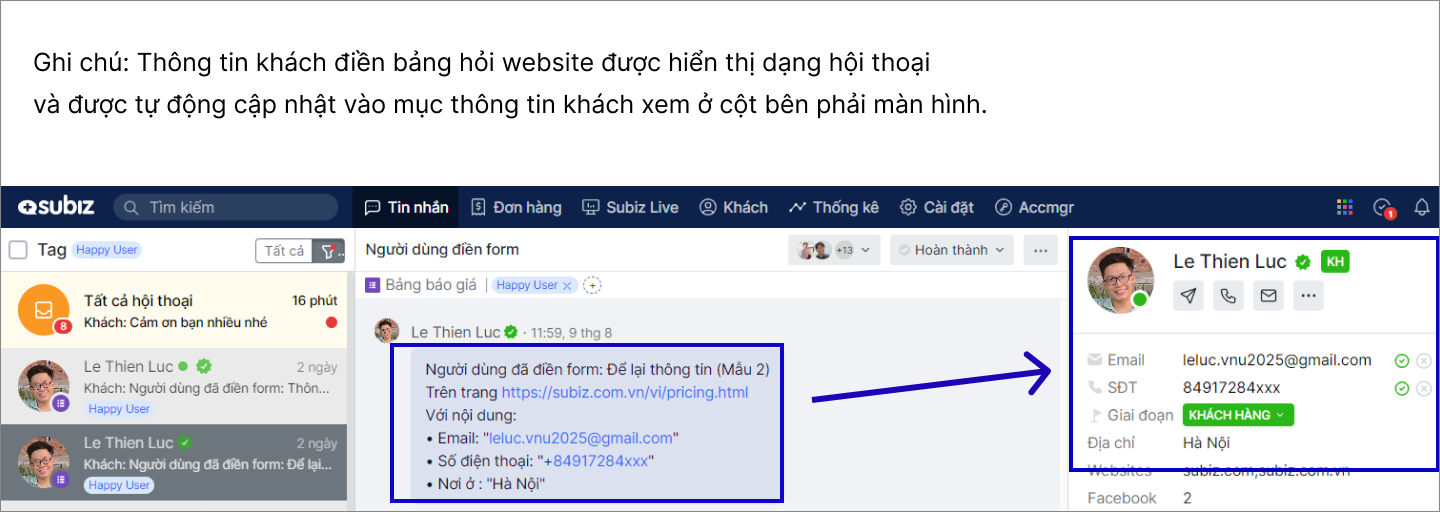 • Thông tin thu thập: Chi tiết các trường thông tin khách đã điền