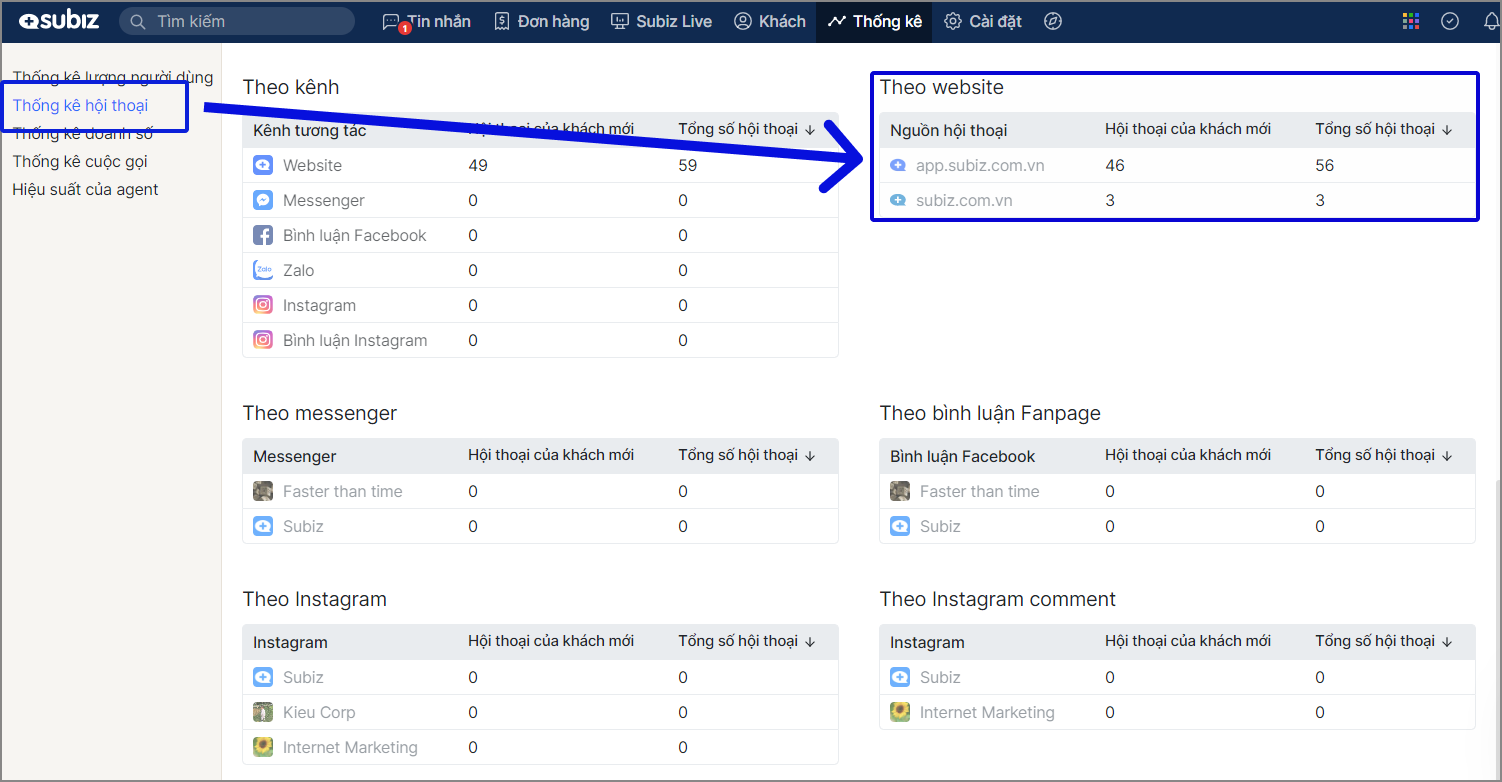 Vào Thống kê hội thoại, chọn Theo website để xem chi tiết số lượng hội thoại từ từng nguồn.