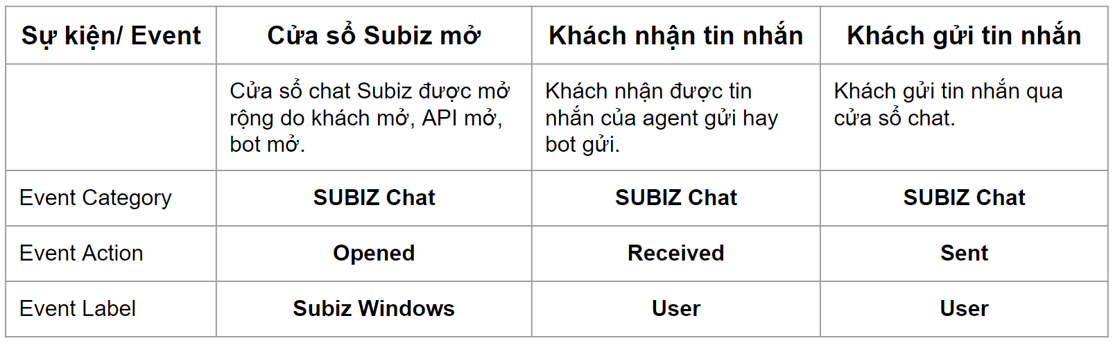 Subiz sẽ gửi các dữ liệu sự kiện (event data) của khách (user) trên website sang Google Analytics. Khi đó, bạn có thể xem được các dữ liệu này tại mục Sự kiện (event) của Google Analytics. Các sự kiện mà Subiz gửi :