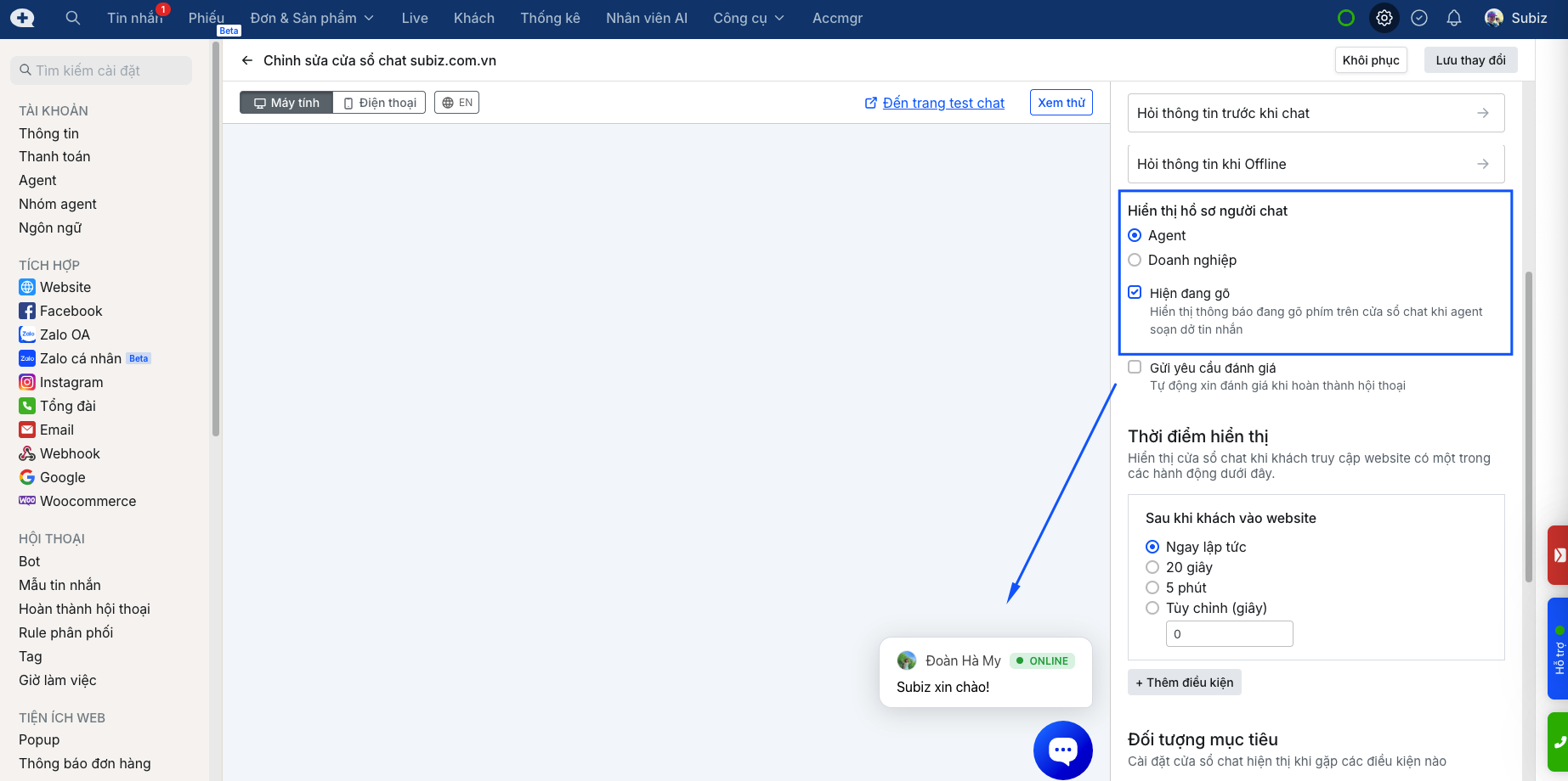 Nhắn tin test trên cửa sổ chat sau đó quay lại trang quản lý hội thoại chat trên Subiz để phản hồi tin nhắn đó.