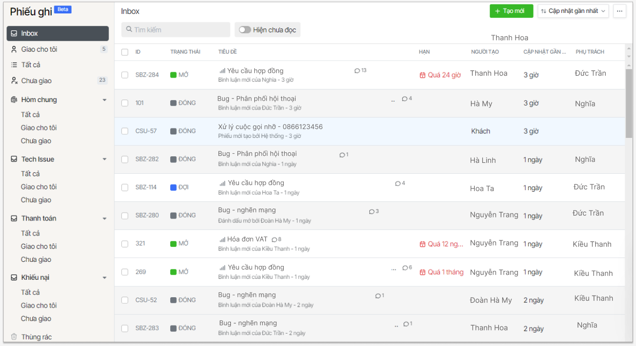 - Tập trung danh sách phiếu ghi từ nhiều nguồn khác nhau như tin nhắn chat, email, cuộc gọi, bảng hỏi thông tin.
