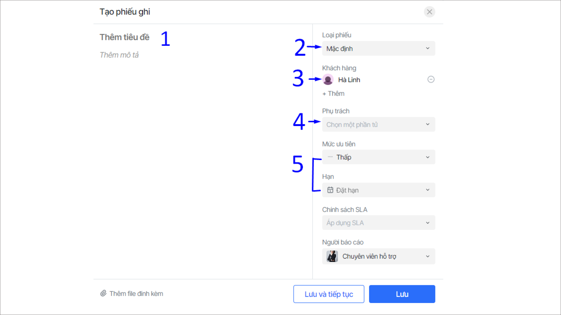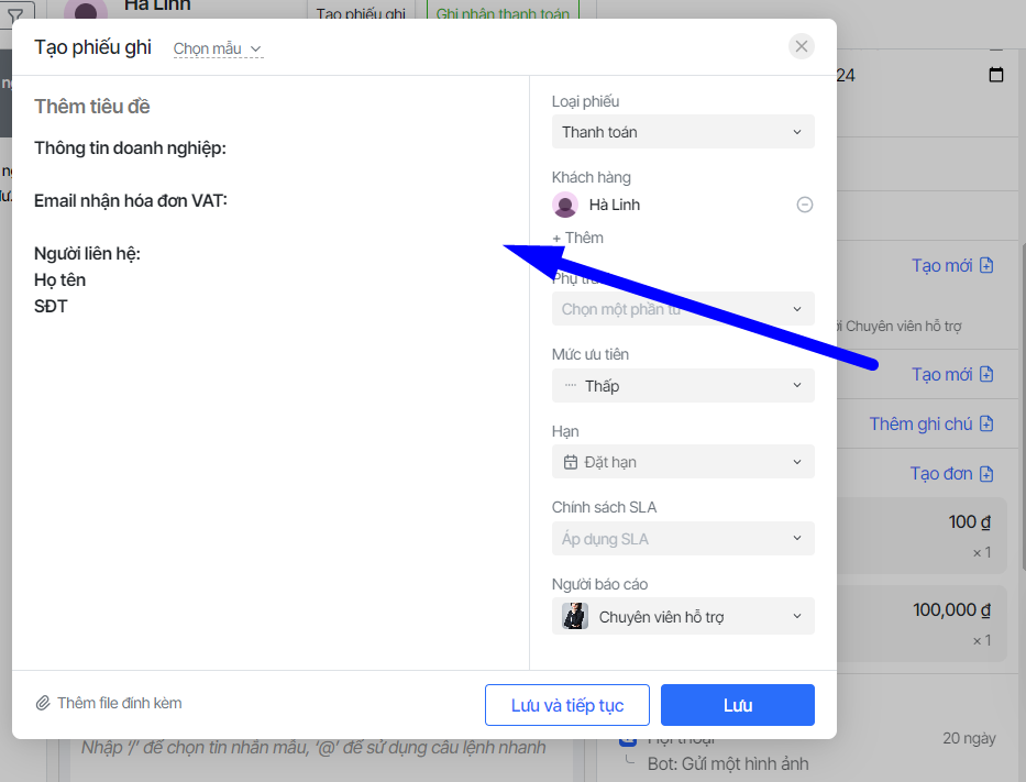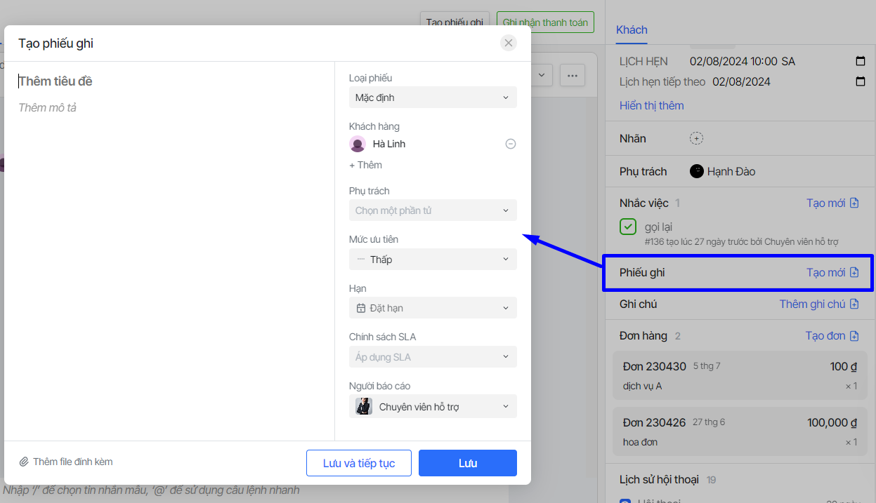 Hướng dẫn agent tạo phiếu ghi hỗ trợ khách hàng