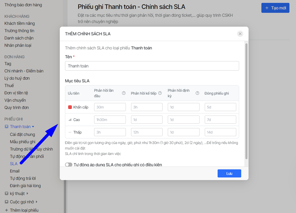 Khi bạn muốn chia các cấp độ ưu tiên xử lý phiếu ghi và có thời hạn cho từng cấp độ, bạn sẽ cài đặt SLA cho phiếu ghi.
