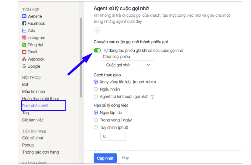 - Kéo xuống mục Agent xử lý cuộc gọi nhỡ, bật ON tự động tạo phiếu ghi khi có cuộc gọi nhỡ