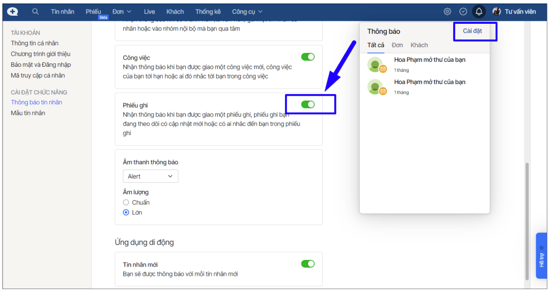 Hướng dẫn cài đặt nhận thông báo phiếu ghi: