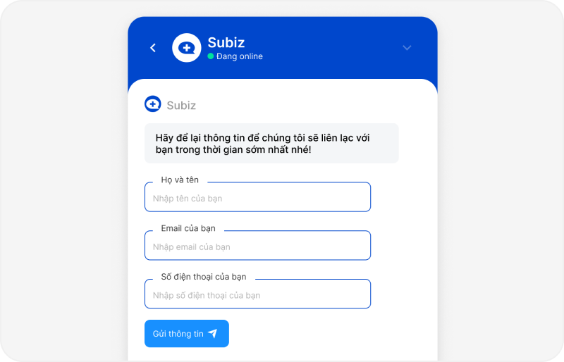 Yêu cầu khách hàng để lại email, SĐT, họ tên, ... trước khi bắt đầu chat hoặc ngoài giờ làm việc. Giúp thu thập thông tin và chuyển đổi khách hàng