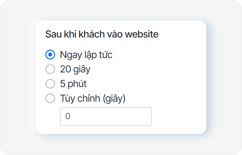 Cài đặt thời gian hiển thị cửa sổ chat ngay khi khách vào website, hoặc sau khi khách vào website một khoảng thời gian nhất định: 10 giây, 1 phút…