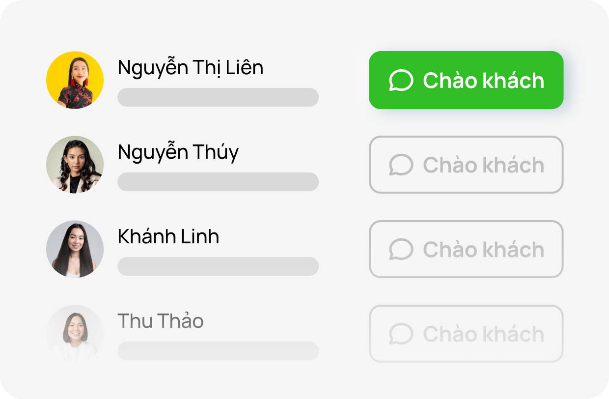 Click “Chào khách” để chủ động nhắn tin trò chuyện với khách hàng. Tiếp cận khách hàng đúng lúc và đúng thời điểm sẽ tăng cơ hội bán hàng hiệu quả.