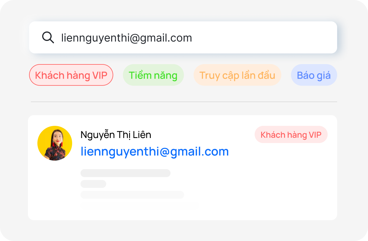 Phân khúc khách hàng theo yêu cầu như khách truy cập lần đầu, khách quay lại qua bộ lọc lịch sử chat. Cũng có thể tìm kiếm thông tin khách truy cập qua tên, email, số điện thoại hoặc nội dung đã trao đổi.