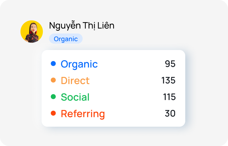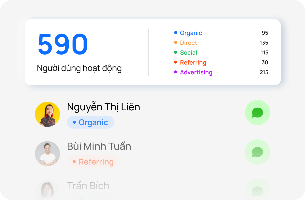Thống kê truy cập người dùng tới từ đâu: Organic, Direct, Social, Referring, Advertising,... tổng số người dùng hoạt động trên trang bao nhiêu và đang tương tác với tư vấn viên nào.