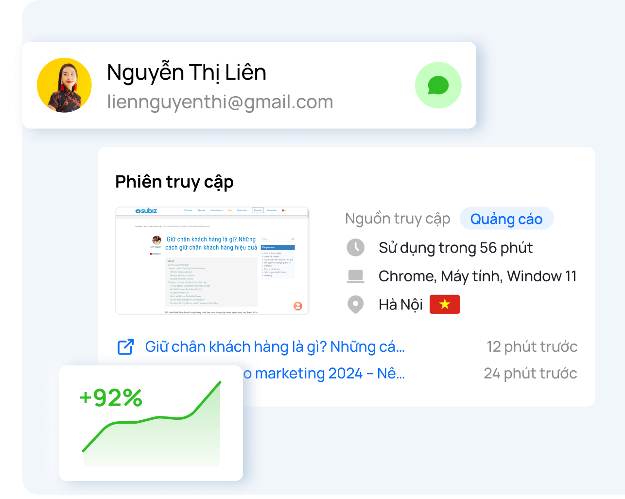 Subiz live giúp quan sát mọi khoảnh khắc tương tác khách hàng truy cập Website. Bạn sẽ biết được khách hàng mới hay cũ, khác đang gặp vấn đề gì để kịp thời hỗ trợ, đảm bảo tương tác 100% trong thời gian sớm nhất